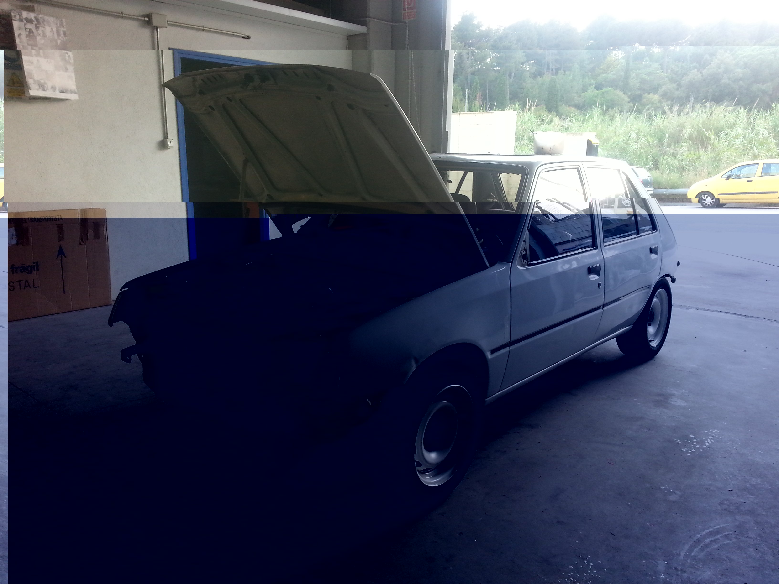 Se pintara entero y se cambiara el capo por el fase 1 con chepa (se ve de fondo en la foto con publicidad, el único que encontré en el desguace) y también se aprovechara para pintar como se merece las llantas de 106 rallye, poner neumáticos nuevos y “”buenos”” no unos durun como llevaba ahora.
