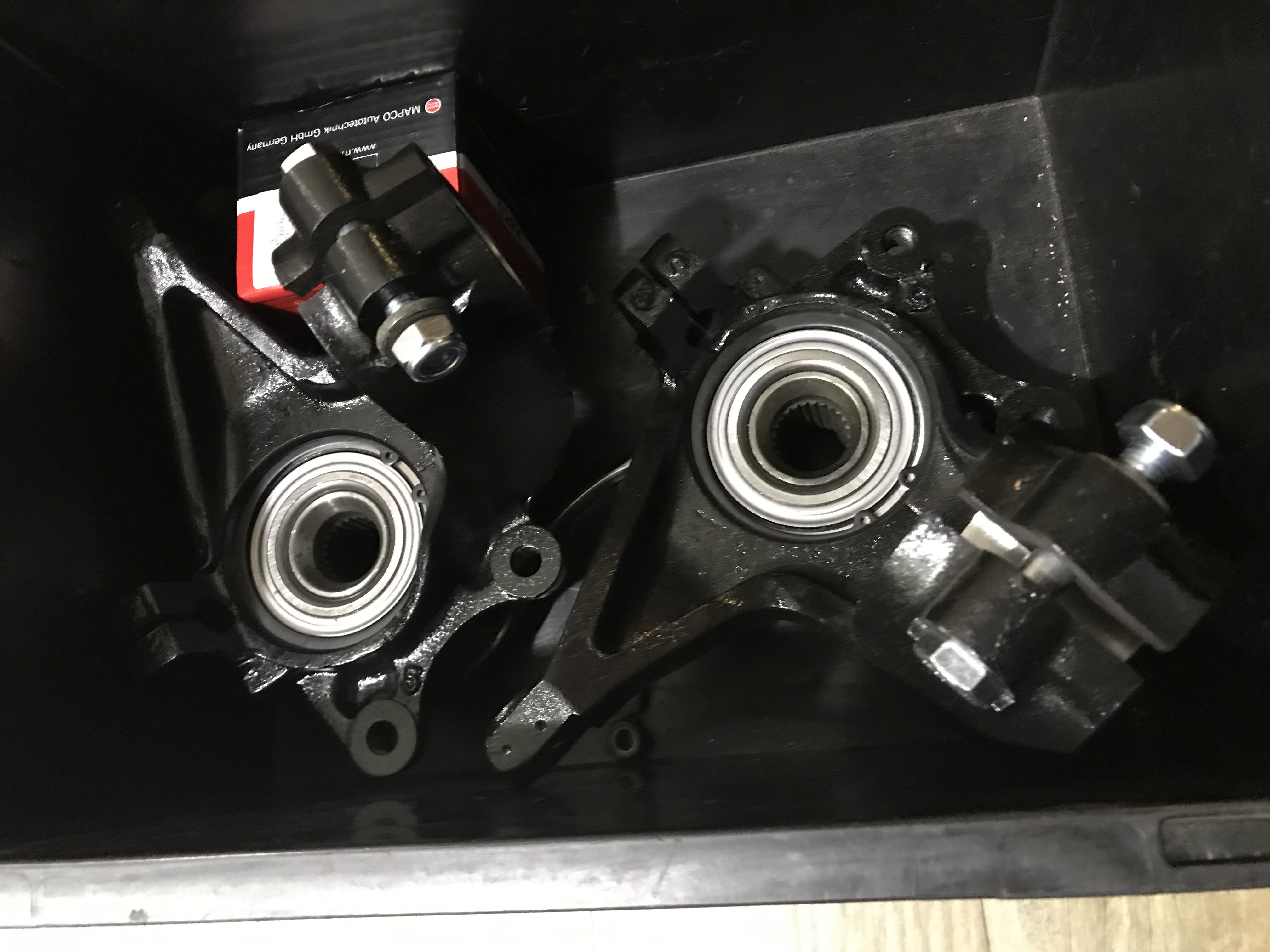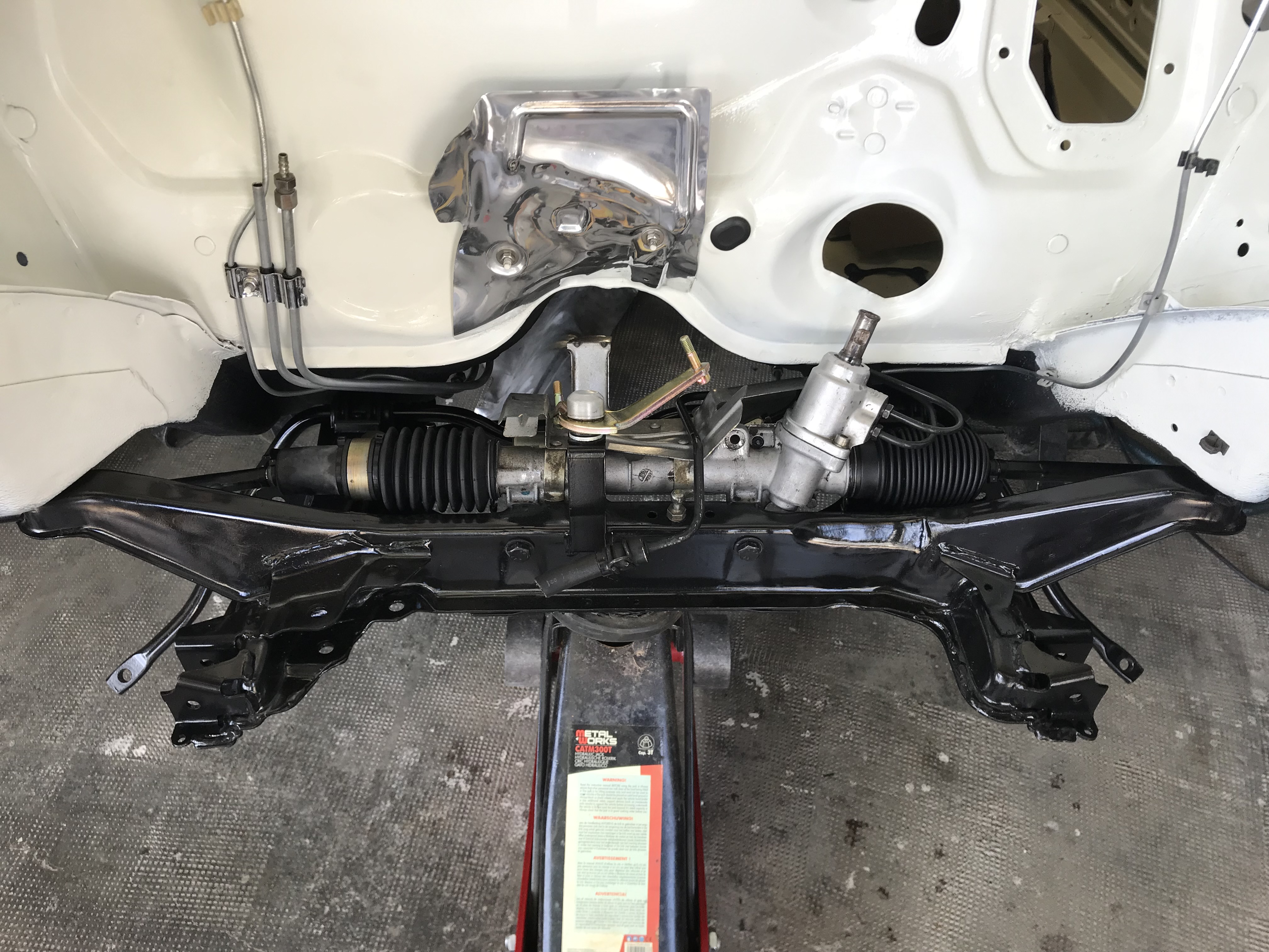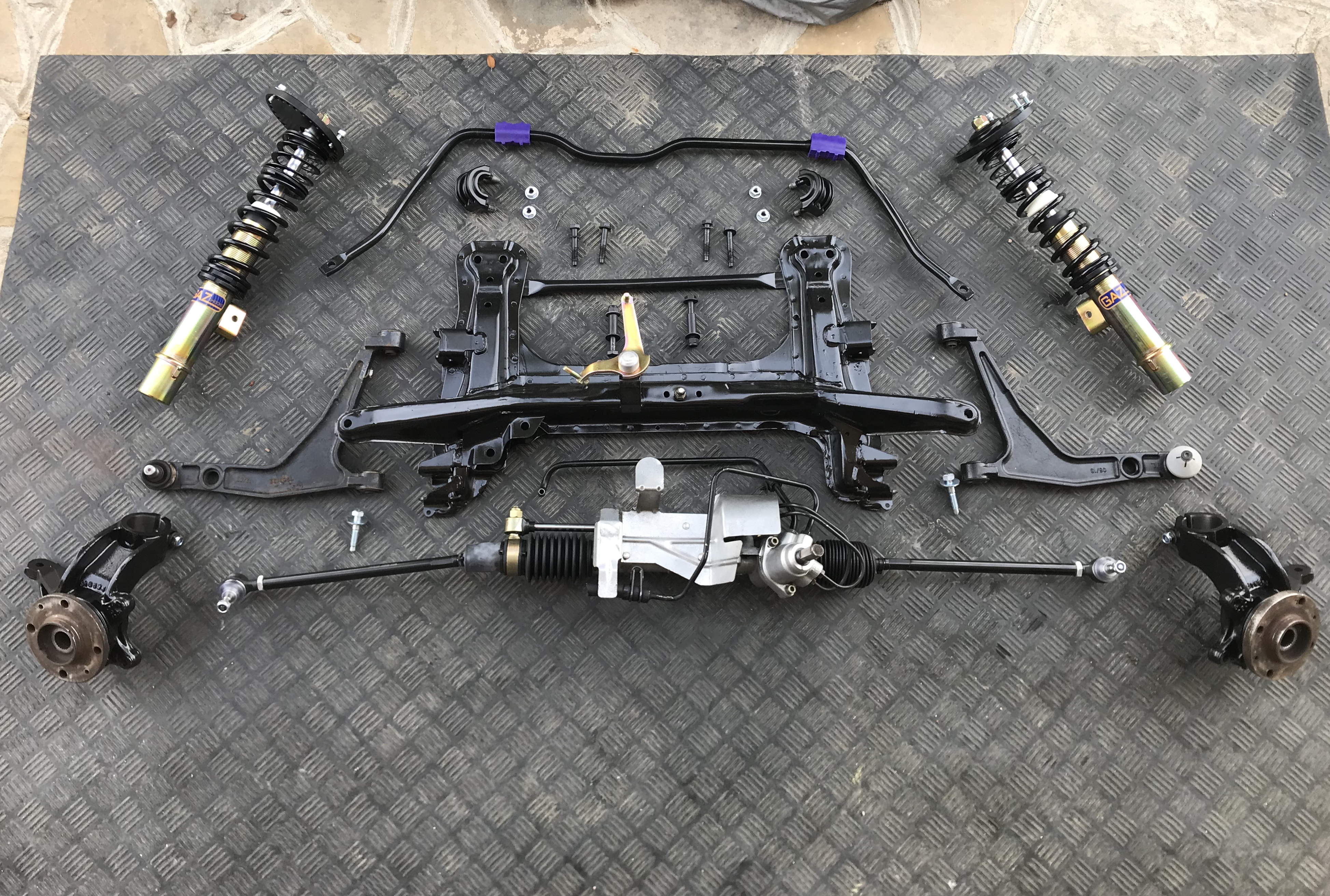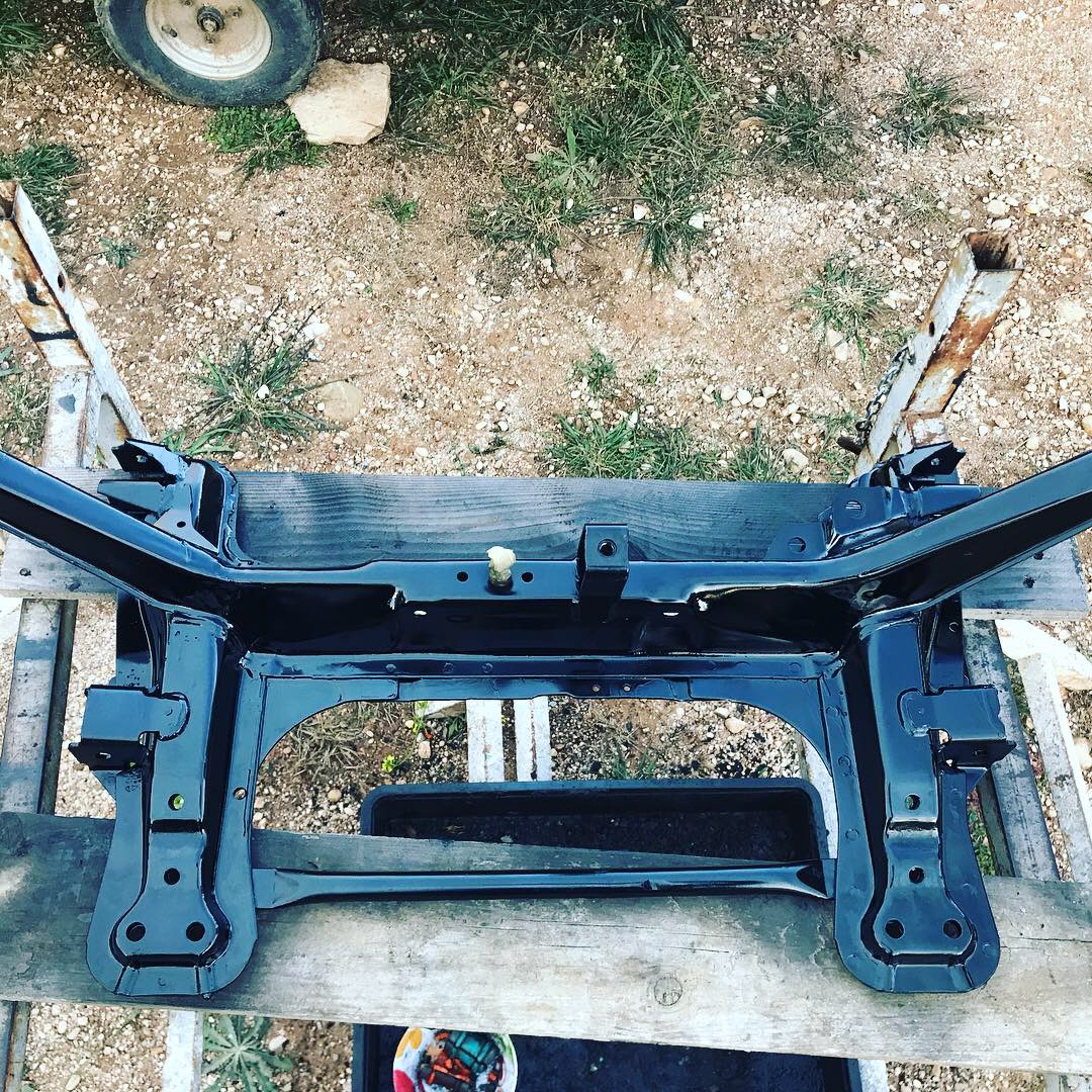 Desmontamos y saneamos cuna para posteriormente montar dirección asistida mecánica de un xsara vts con menos de 3 vueltas de volante de lado a lado, rodamientos de bujes nuevos, gomas estabilizadora Power Flex, trapecios y palieres de 309 Gti que luego por como quedaban de ancho con los separadores delanteros al llevar frenos de 4 pistones tuve que venderlos y comprar palieres y trapecios de 205, me vine arriba… y también con las roscadas GAZ que tampoco llegué a dejar montadas definitivas ya que me quedaba muy bajo y rozaba en los aletines.