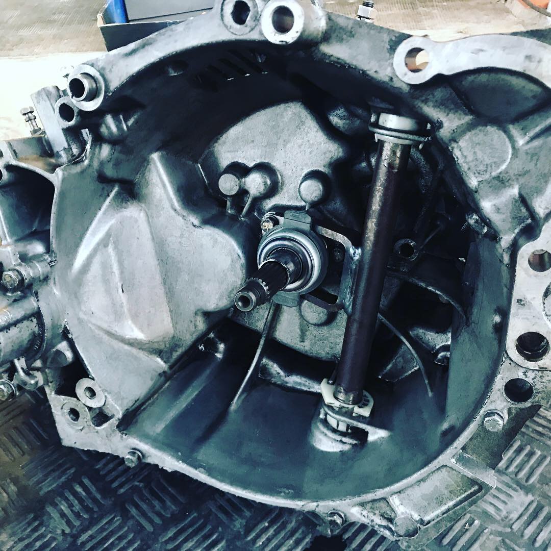 De la caja de cambios llevo la leva que empuja el cojinete junto con los casquillos de la misma de la caja del mi16, que tiene más palanca y queda más fino el tacto del embrague..