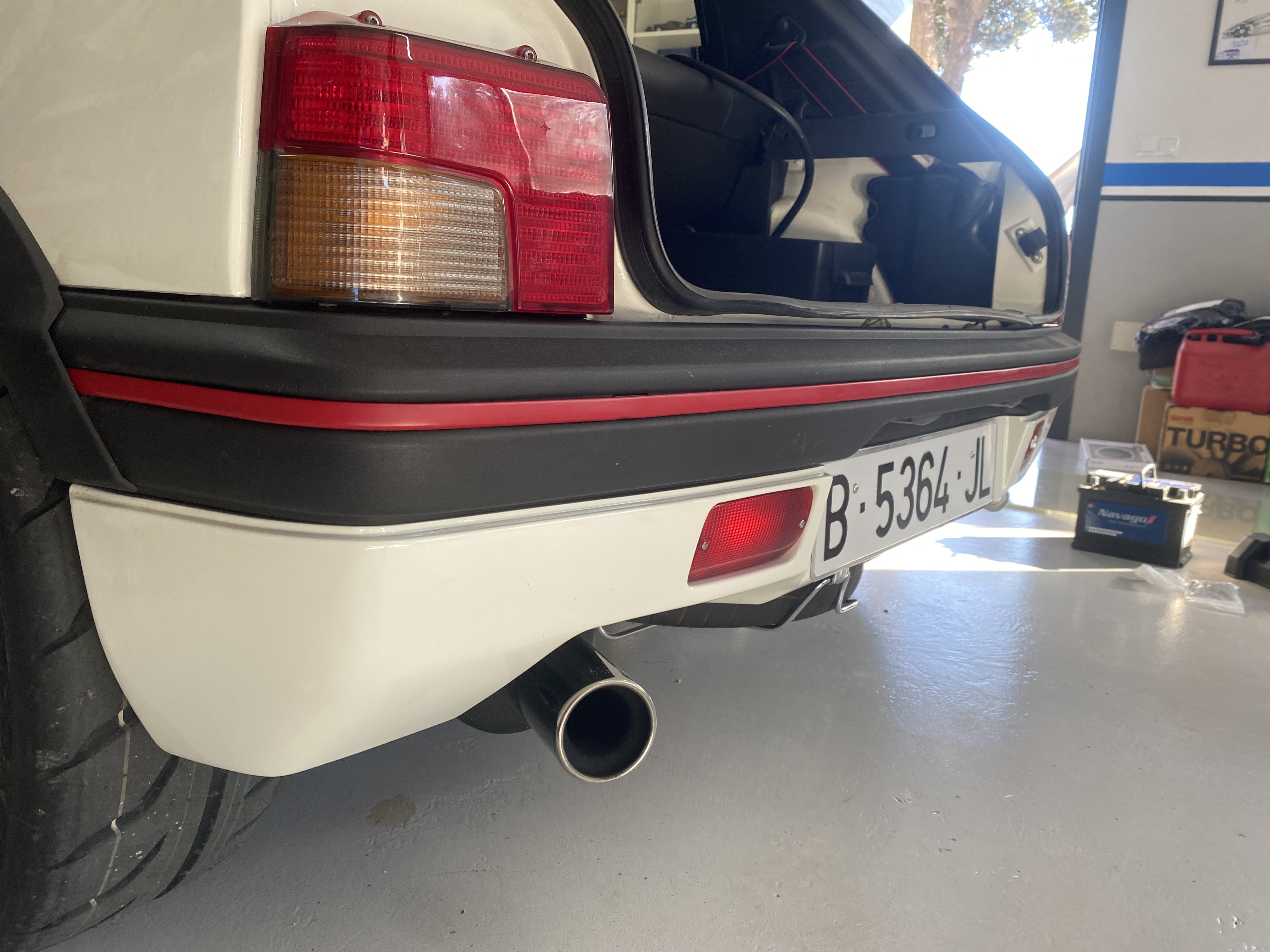 El 18 lo subo a Igualada a alinear al curro de mi amigo Checa (Red205) y los dias posteriores colocamos emblemas, tiras en los paragolpes y la bandeja la pinto con sprai negro, el resultado me sorprende..