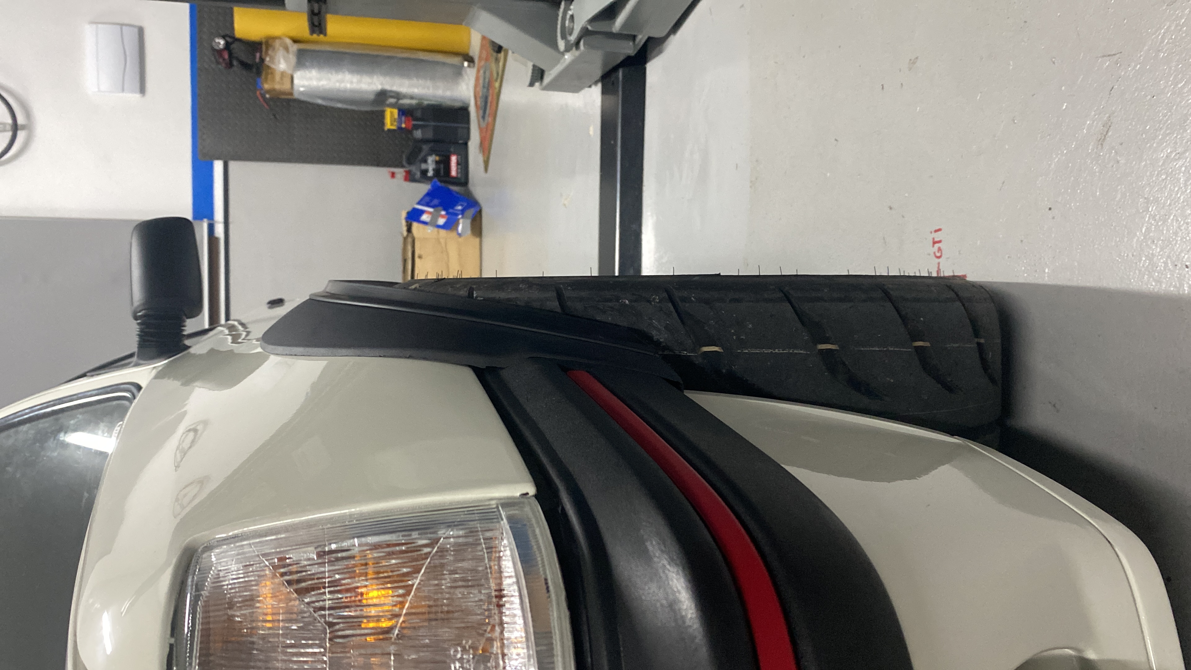 Pinto la piña del volante en negro, hago un apaño con las grapas de los paneles para colocar las cuerdas de la bandeja y le coloco unas molduras de goma en los aletines para que no sobre salga el neumático por fuera de las aletas para pasar la homologación.