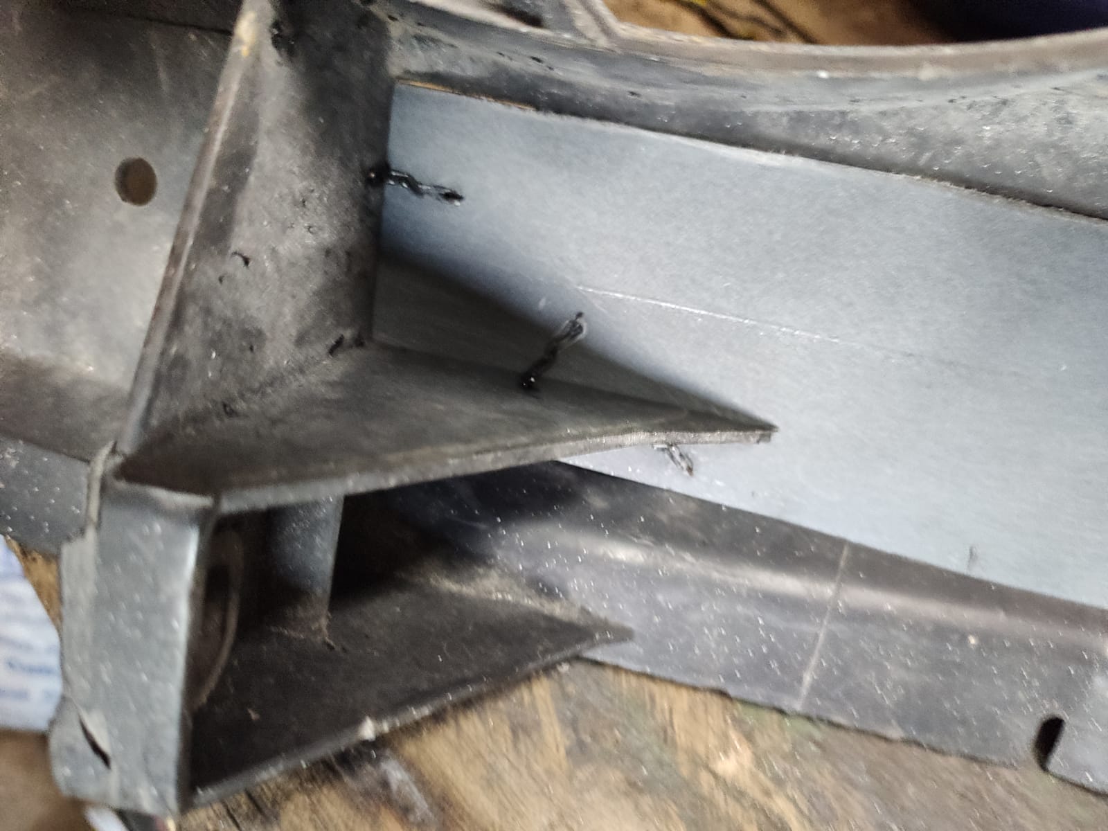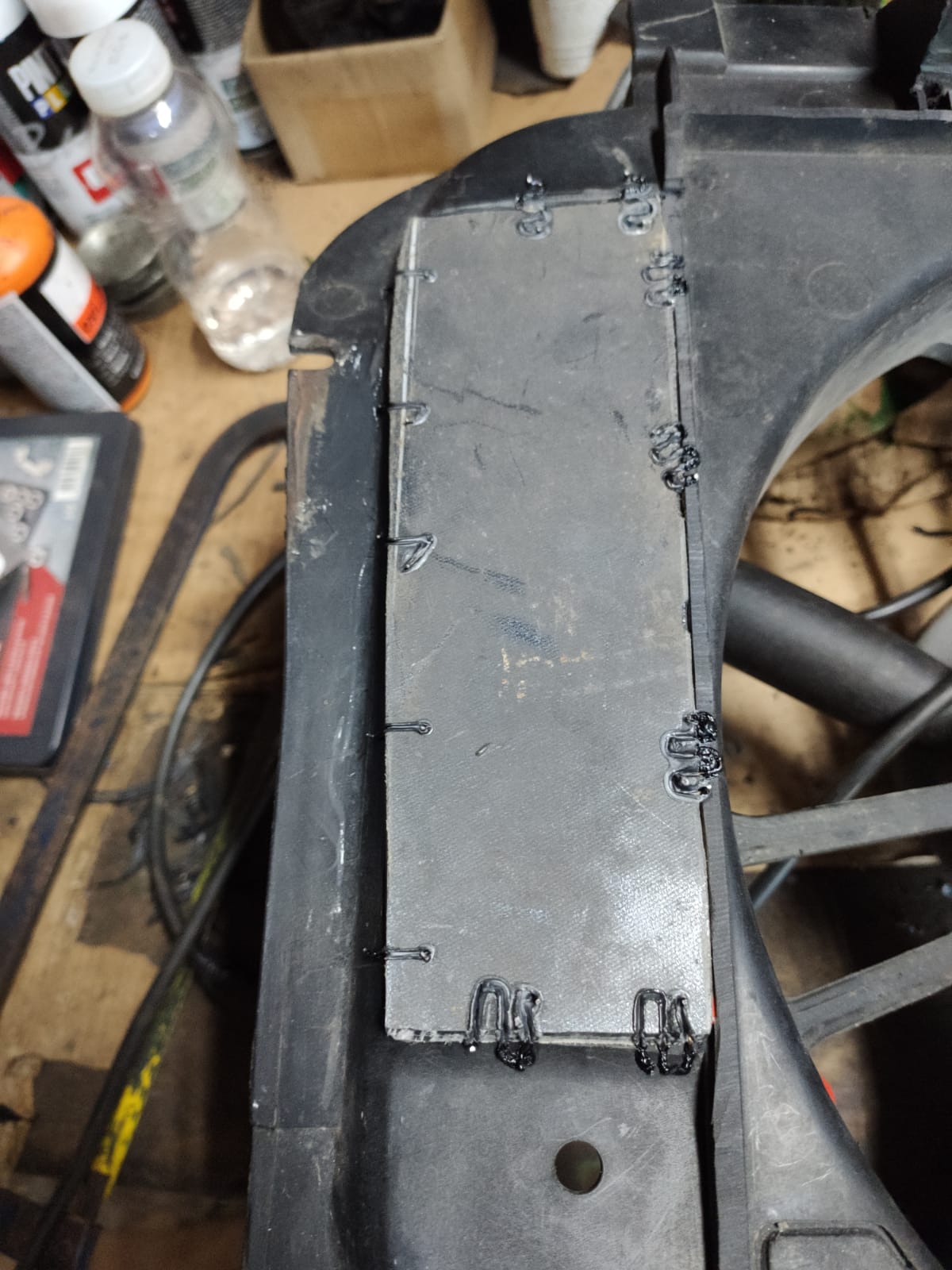 Aquí estoy preparando las zonas cortadas para añadir unos recortes planos, para que hagan de cierre a la vez que de refuerzo.. después los he soldado con grapas.... tanto en los bordes, como en los refuerzos de la cara delantera donde va sujeta la calandra....