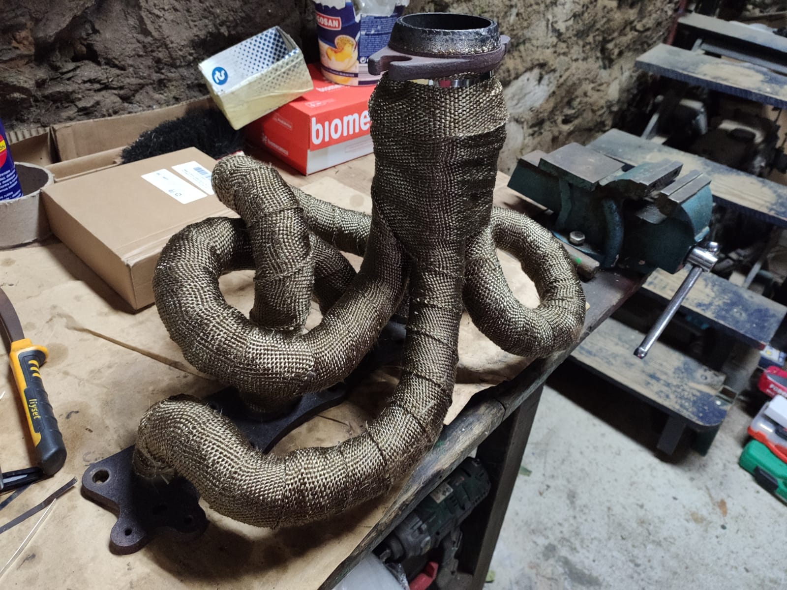 O casi listo... nos falta por montar el colector de escape, pero antes, he decidido encintar el colector para intentar bajar un poco la temperatura en la chapa cofre... a ver el resultado.....