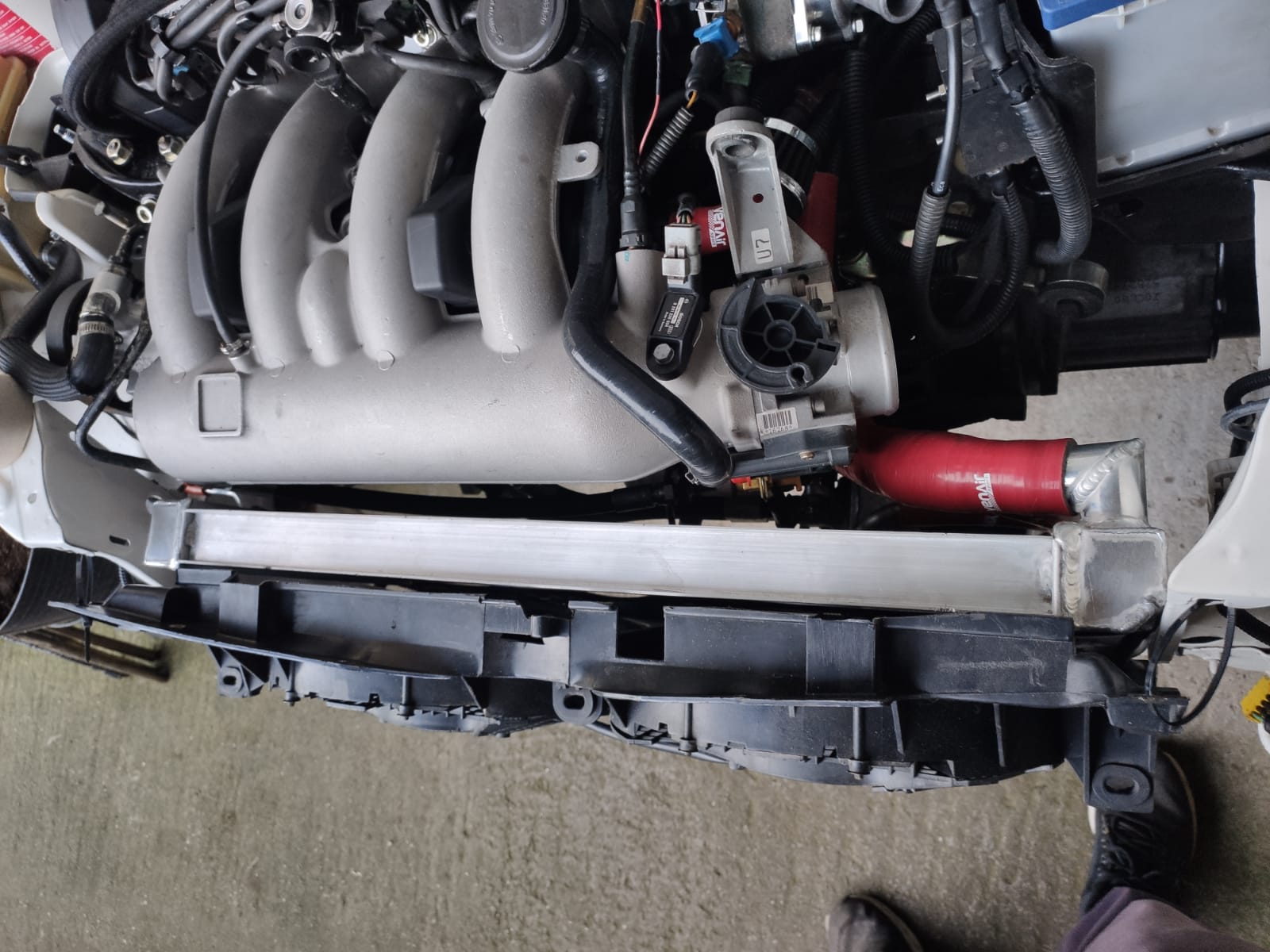 Hemos chafado, reducido la esquina superior izquierda del radiador para que no toque en el ojal izquierdo, y la salida pequeña de 8mm del lado derecho, la hemos modificado para que salga hacia abajo... así podemos inclinar el radiador lo máximo hacia delante y librar el colector de admisión...