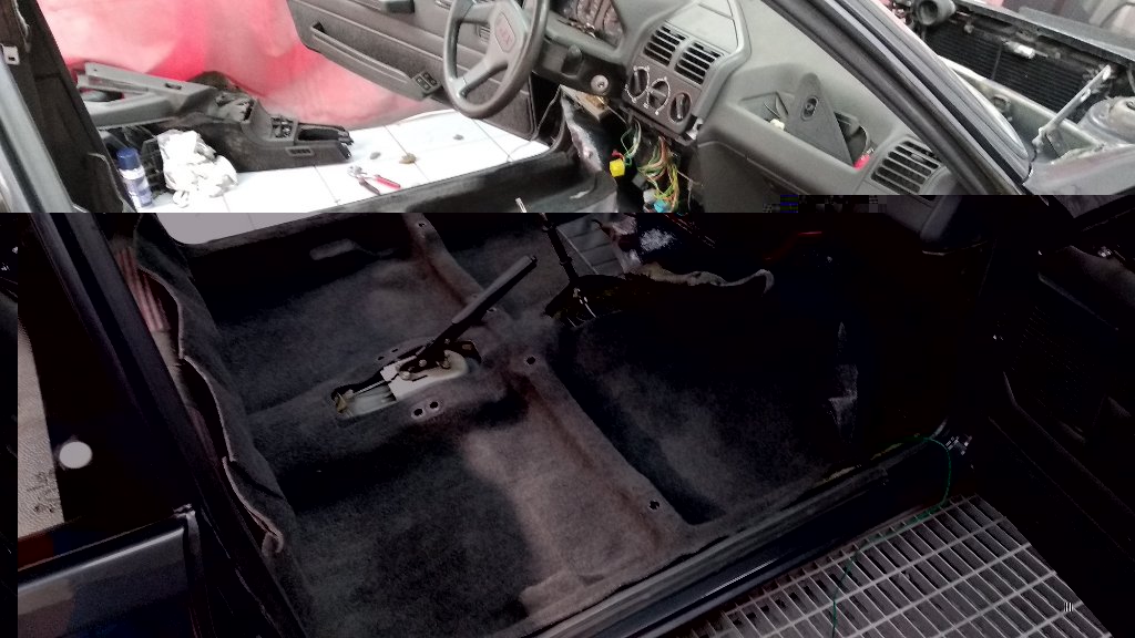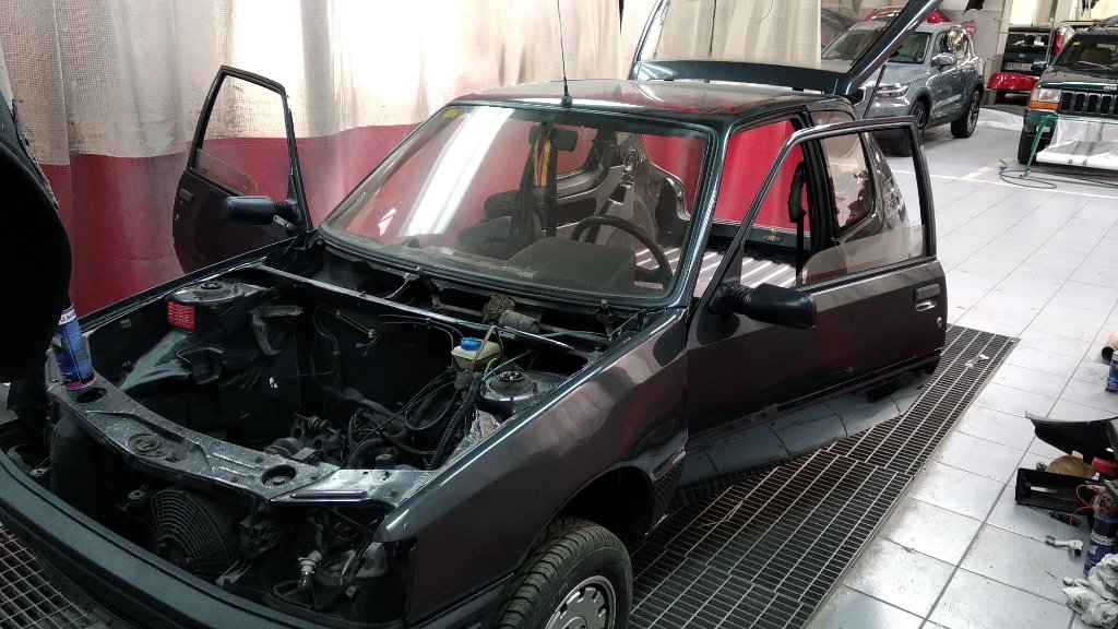Bueno, seguimos con el proceso. Una vez desmontado ya movimos el coche y todas las piezas al taller. (Aparte de que por tercera vez me entraron a robar. Esta vez la caja mannesman verde mitica, y el pomo del 205. Los otros dos robos fueron en su día las molduras rojas de las defensas, y otra vez la radio rompiendome toda la consola central.
